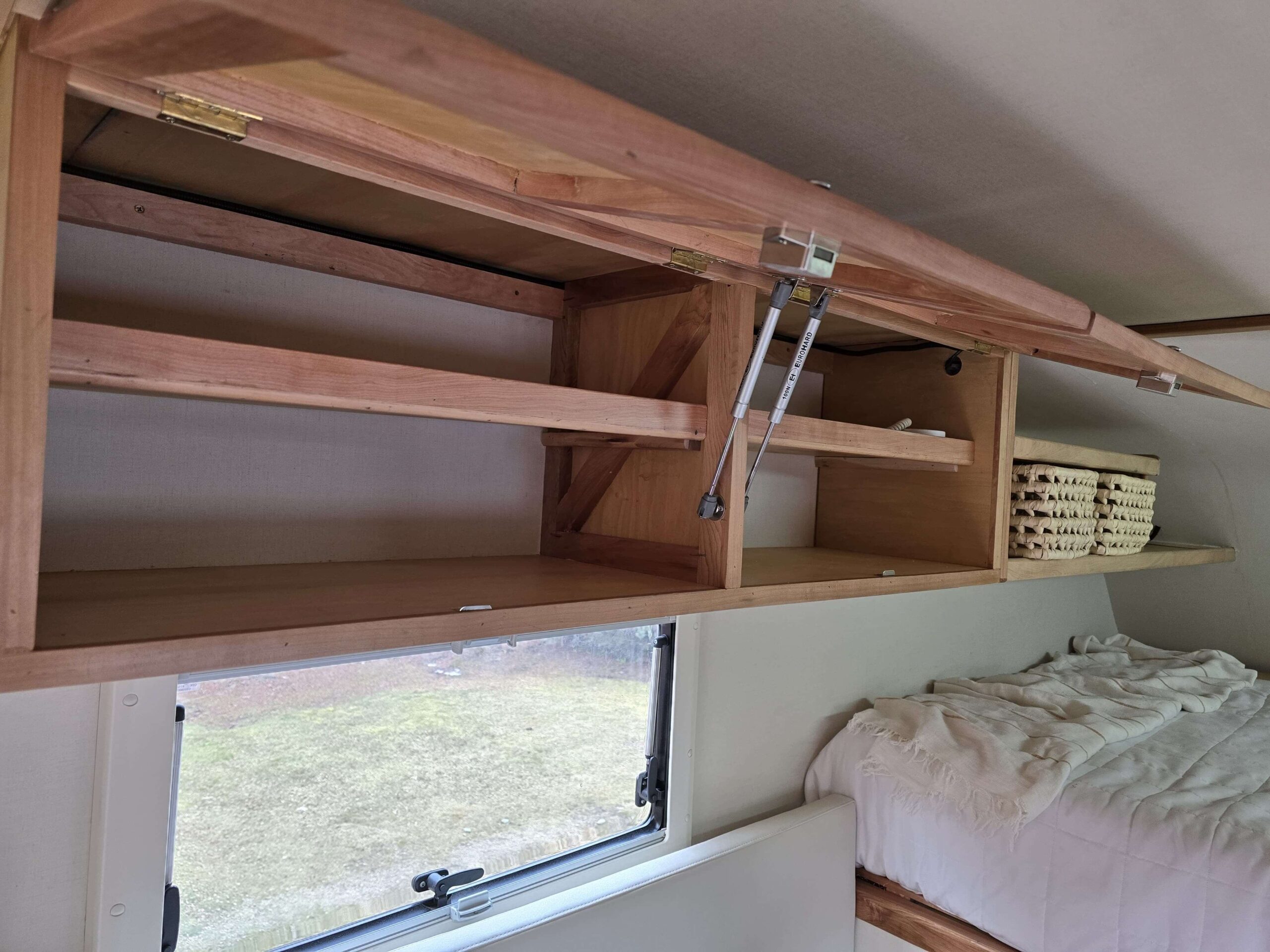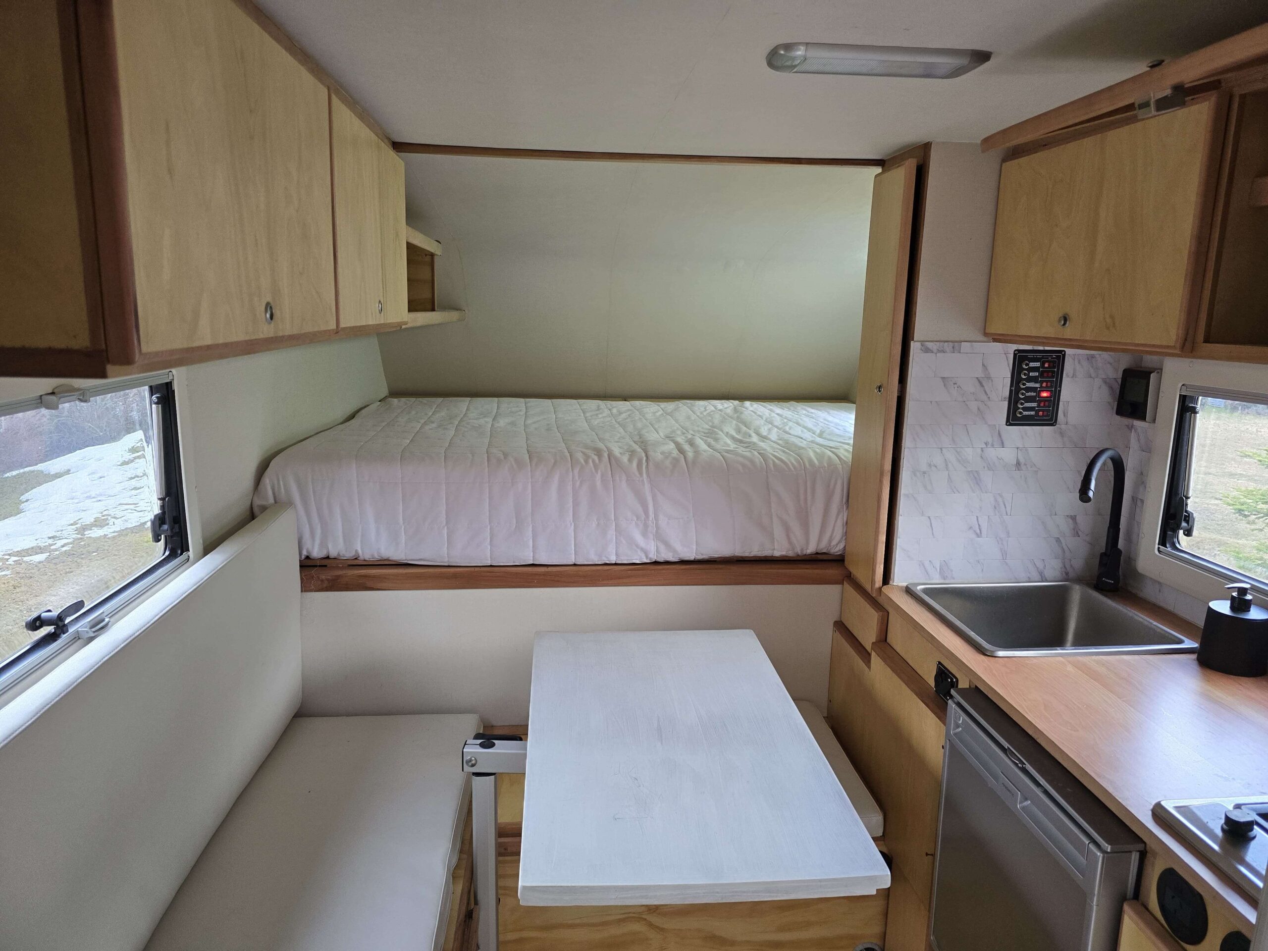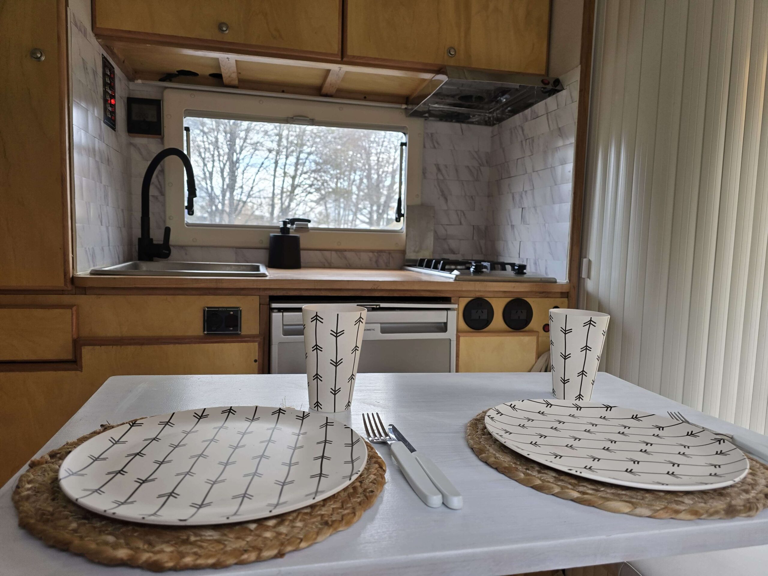 Agua: bomba de agua eléctrica. Tanque 100 litros agua blanca (agua potable). Dos tanques de agua gris (30 litros cada uno) y un tanque de agua negra extraíble para su descarga (20 litros – inodoro tipo Practi Potty).