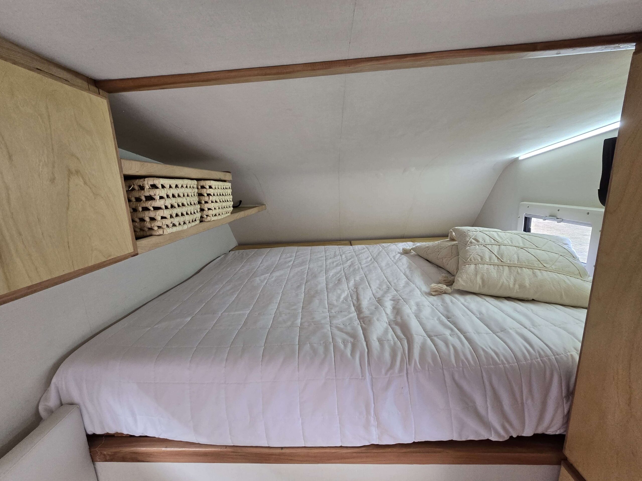 Cama principal (1,90 x 1,40 mts.) y una cama auxiliar (1,90 x 1,00 mts.) con disposición longitudinal, que permite circular desde la cama principal hasta el baño/cocina/puerta de salida.